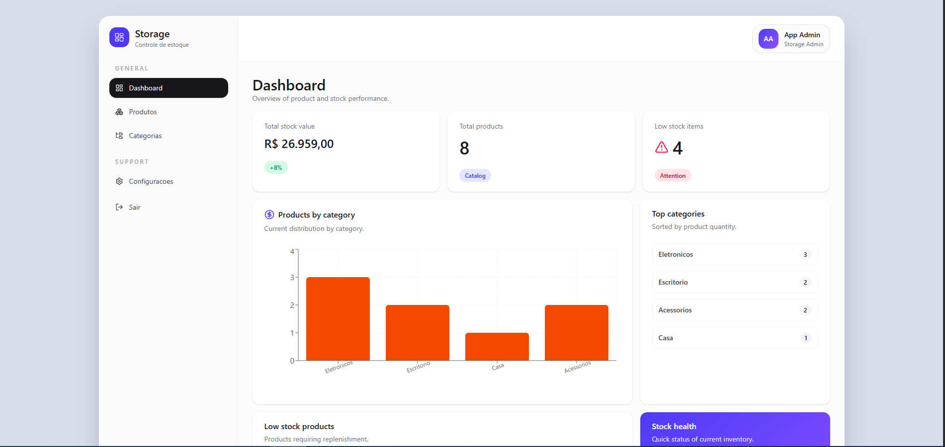 - Dashboard com gráfico de produtos por categoria e lista de itens com estoque baixo