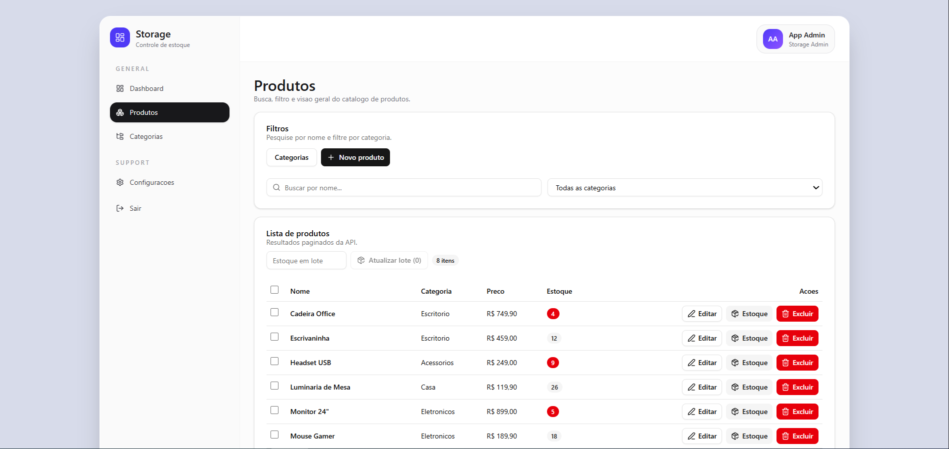 - CRUD completo de produtos e categorias com paginação e filtros por nome e categoria